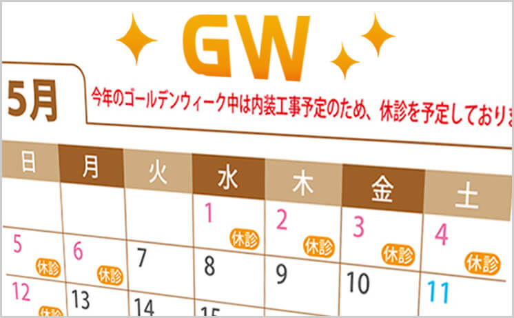 | 休日 | 水曜・日曜日(特殊診療日を除く)・祝日 ※祝日のある週の水曜日は診療 ※夏期休暇・年末年始休暇・年間休日115日(昨年度実績)・完全週休2.5日 |